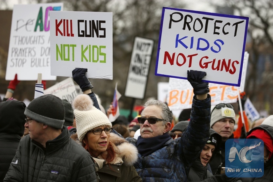People take part in the "March for Our Lives" rally in Chicago, the United States, on March 24, 2018. (Xinhua/Wang Ping)