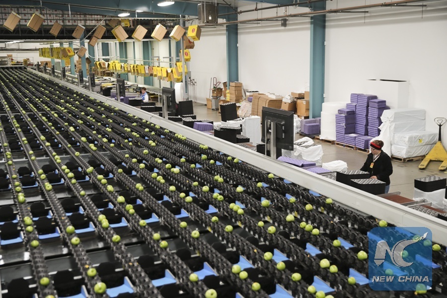 Granny smith apples are processed on a packing line at a packing house of Auvil Fruit Company in Wenatchee, Washington State, the United States, on Nov. 3, 2017. (Xinhua/Wang Ying)