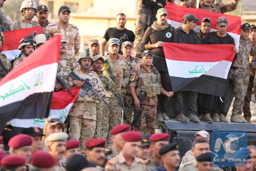 Iraqi soldiers attend a celebration for liberation of Mosul in Mosul, Iraq, July 10, 2017. Haider al-Abadi on Monday formally declared Mosul liberated from Islamic State (IS) militant group after nine months of fierce fighting to dislodge the extremist militants from their last major stronghold in Iraq. (Xinhua/Khalil Dawood)