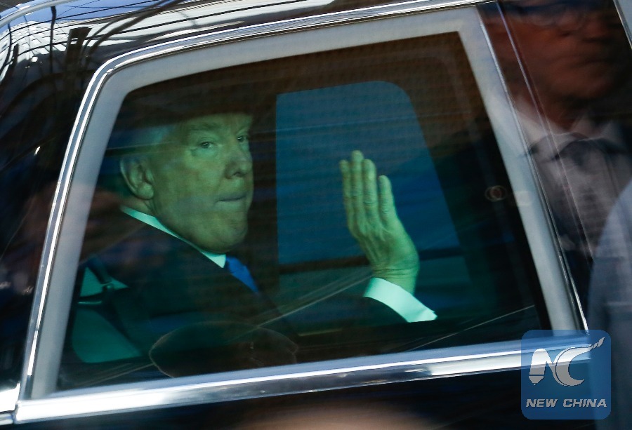 U.S. President Donald Trump waves his hand as he leaves the European Council headquarters after EU-USA Leaders' Meeting, in Brussels, Belgium, May 25, 2017. (Xinhua/Ye Pingfan)