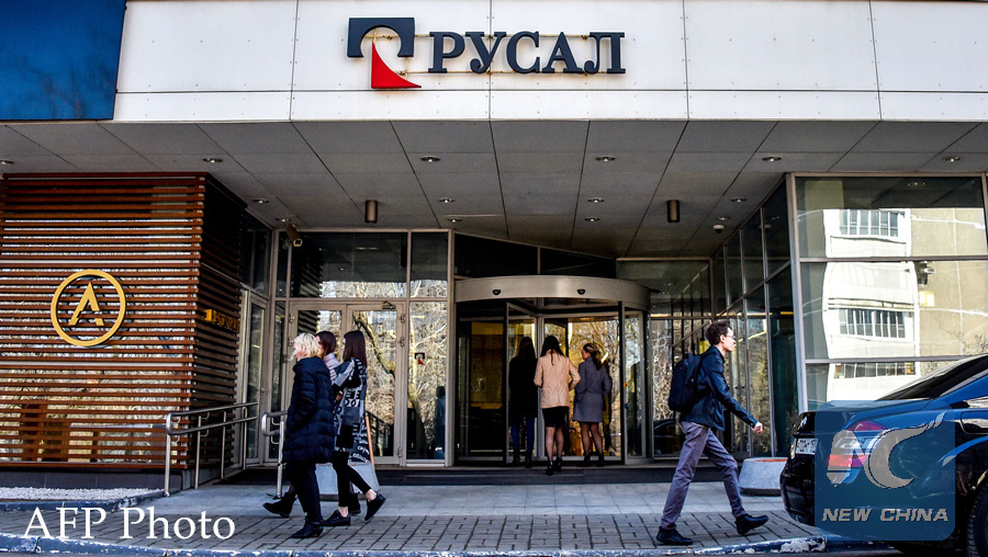 MOSCOW, April 9 (Xinhua) -- New U.S. sanctions imposed on major Russian businesses and their owners sent Russian stocks and the ruble, the country's currency, sharply down Monday, exchange data showed.