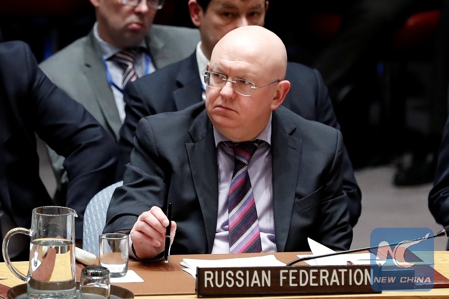 Photo taken on April 10, 2018 shows Russian Ambassador to the United Nations Vassily Nebenzia attending a Security Council meeting on Syria at the UN headquarters in New York. Russian Ambassador to the United Nations Vassily Nebenzia on Thursday warned the United States against military action on Syria. (Xinhua/Li Muzi)