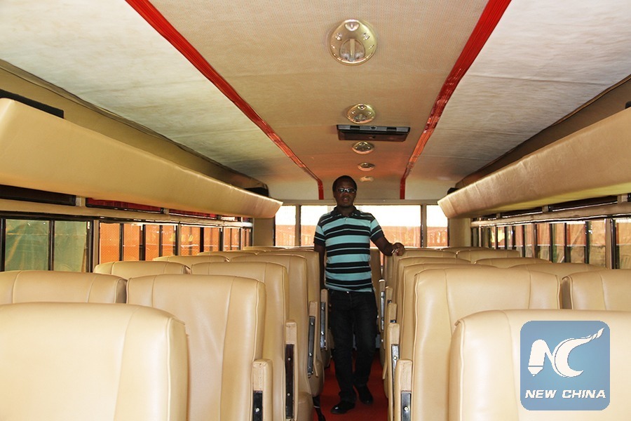 Allan Muhumuza, Vice President in charge of Marketing and Sales at Kiira Motors Corporation (KMC), explains the inner laylout of a solar powered bus. (Xinhua/Zhang Gaiping)