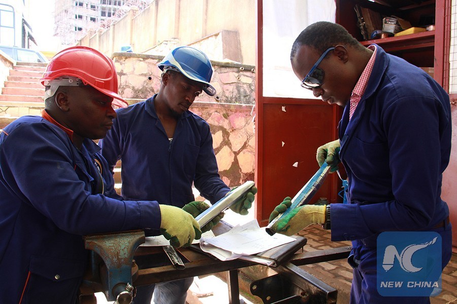 Workers work on auto parts in accordance with a blueprint at a factory of Kiira Motors Corporation in the capital Kampala, Uganda (Xinhua/Zhang Gaiping)