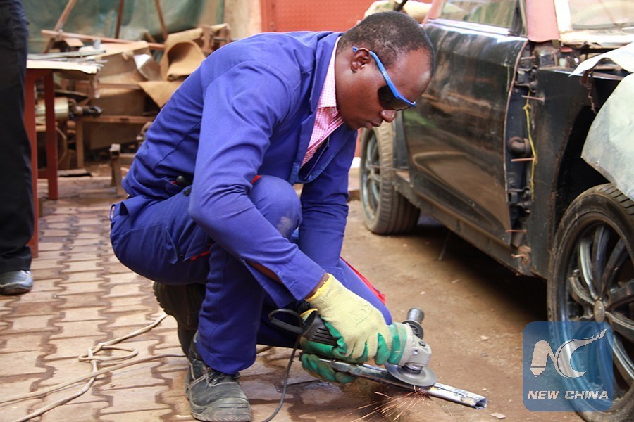A worker work on an auto part that belongs to a hybrid vehicle at a factory of Kiira Motors Corporation in the capital Kampala, Uganda (Xinhua/Zhang Gaiping)