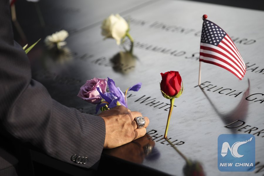 File Photo: A man places a flower on a plate on which the names of 9/11 victims were inscribed around the South Pool at the National September 11 Memorial and Museum in New York, the United States, on Sept. 11, 2017. (Xinhua/Wang Ying)