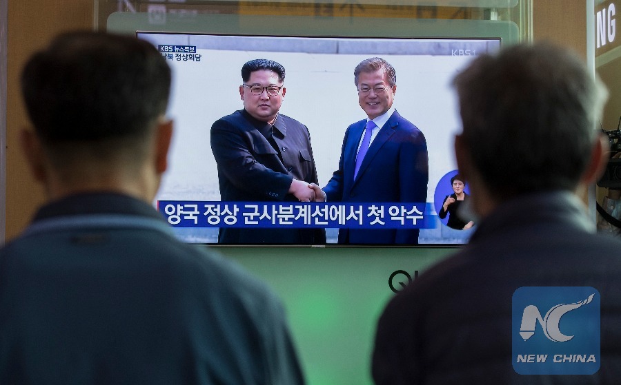People watch news from a screen on the meeting of South Korean President Moon Jae-in and top leader of the Democratic People's Republic of Korea (DPRK) Kim Jong Un, at a railway station in Seoul, South Korea, April 27, 2018. (Xinhua/Lee Sang-ho)