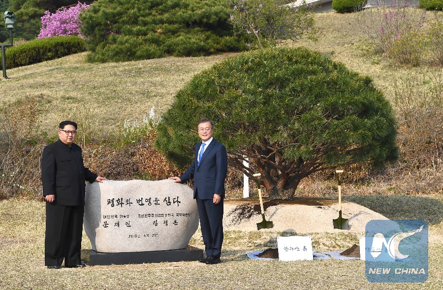 South Korean President Moon Jae-in (R) and Kim Jong Un, top leader of the Democratic People's Republic of Korea (DPRK), hold a commemorative event to plant a pine tree, beside a path near the military demarcation line, April 27, 2018. (Xinhua/Inter-Korean Summit Press Corps)