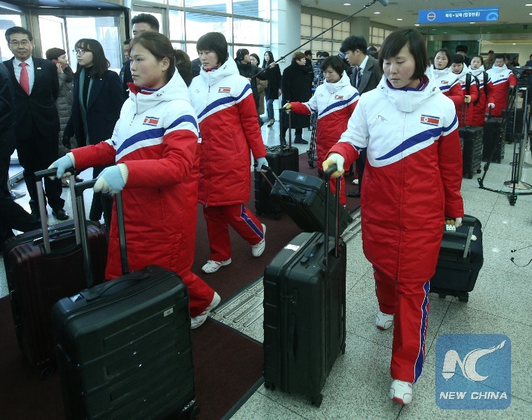 Women's ice hockey team of the Democratic People's Republic of Korea (DPRK) arrive in Paju, South Korea, on Jan. 25, 2018. A women's ice hockey team of the DPRK crossed the inter-Korean land border Thursday to South Korea for a joint training with their South Korean counterparts as the two sides agreed to field a unified team during the upcoming Winter Olympics. (Xinhua/South Korean Unification Ministry)