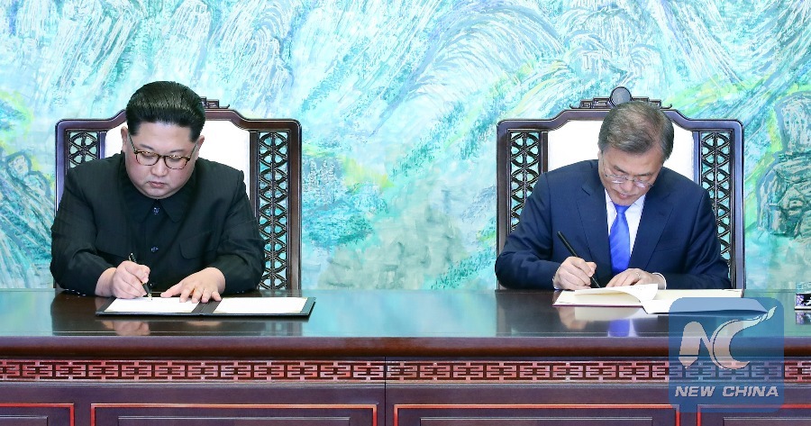 South Korean President Moon Jae-in (R) and Kim Jong Un, top leader of the Democratic People's Republic of Korea (DPRK) sign for their joint declaration, titled the Panmunjom Declaration for Peace, Prosperity and Unification of the Korean Peninsula, at Peace House on the South Korean side of Panmunjom, on April 27, 2018. (Xinhua/Inter-Korean Summit Press Corps)