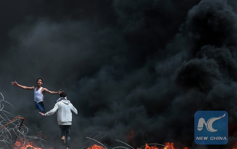 Palestinian protesters take part in a clashes with Israeli troops on the Gaza-Israel border, east of Gaza City, on April 27, 2018. (Xinhua)