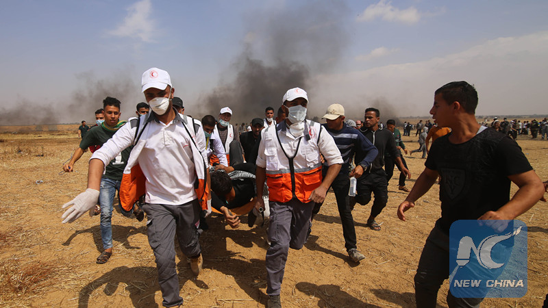 Palestinian medics carry an injured man during clashes with Israeli troops on the Gaza-Israel border, east of Khan Younis City in the southern Gaza Strip, on April 27, 2018. (Xinhua)