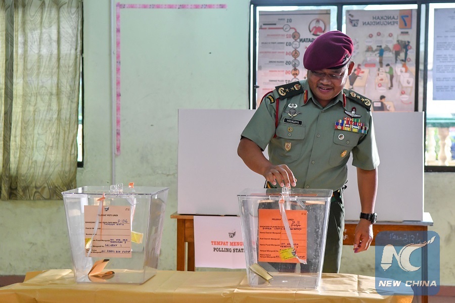 A military officer casts his vote at a polling station during the early voting for general election in Malacca, Malaysia, May 5, 2018. (Xinhua/Chong Voon Chung)