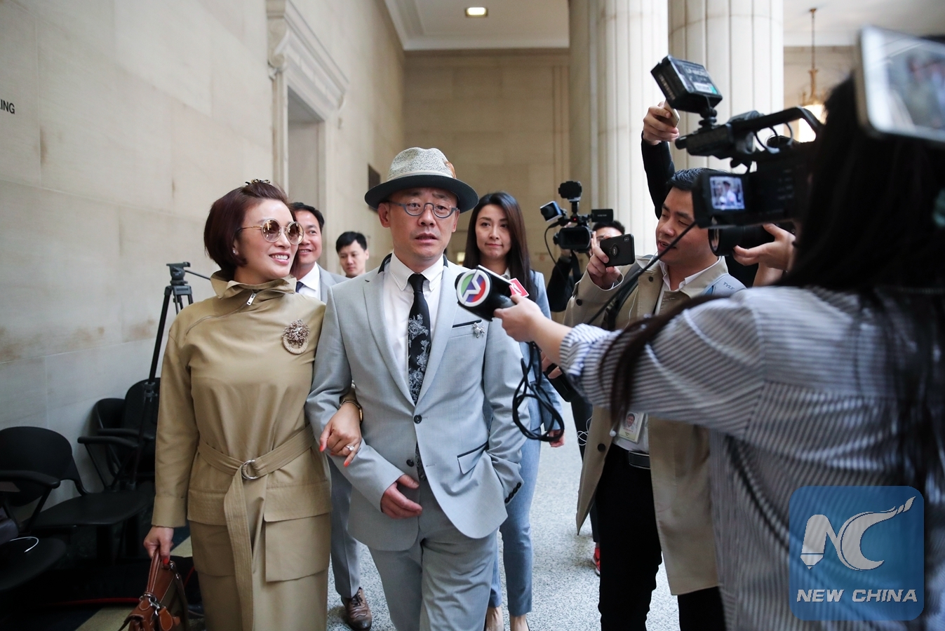 Chinese comedian Zhou libo and his wife Hu Jie are on their way to the courtroom in Nassau County, New York, the United States, May 9, 2018. Zhou's case on weapon and drug charges will resume court on May 24.