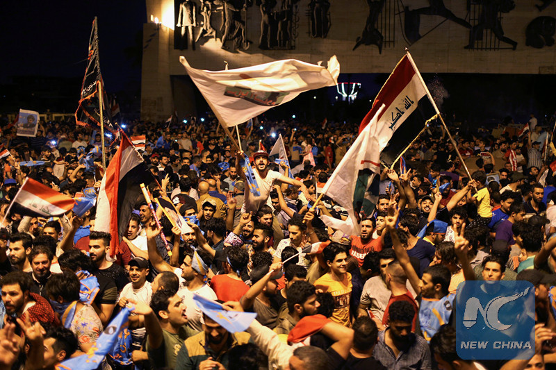 Iraqi supporters of Sairun list celebrate after results of Iraq's parliamentary election were announced in Baghdad, Iraq May 14, 2018. (REUTERS)