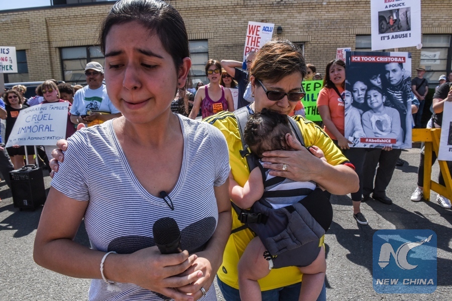 Sharon Chajon, whose husband is a detained immigrant, cries while people participate in a protest against recent U.S. immigration policy of separating children from their families when they enter the United States as undocumented immigrants, in front of a Homeland Security facility in Elizabeth, NJ, U.S., June 17, 2018. (Xinhua/REUTERS)