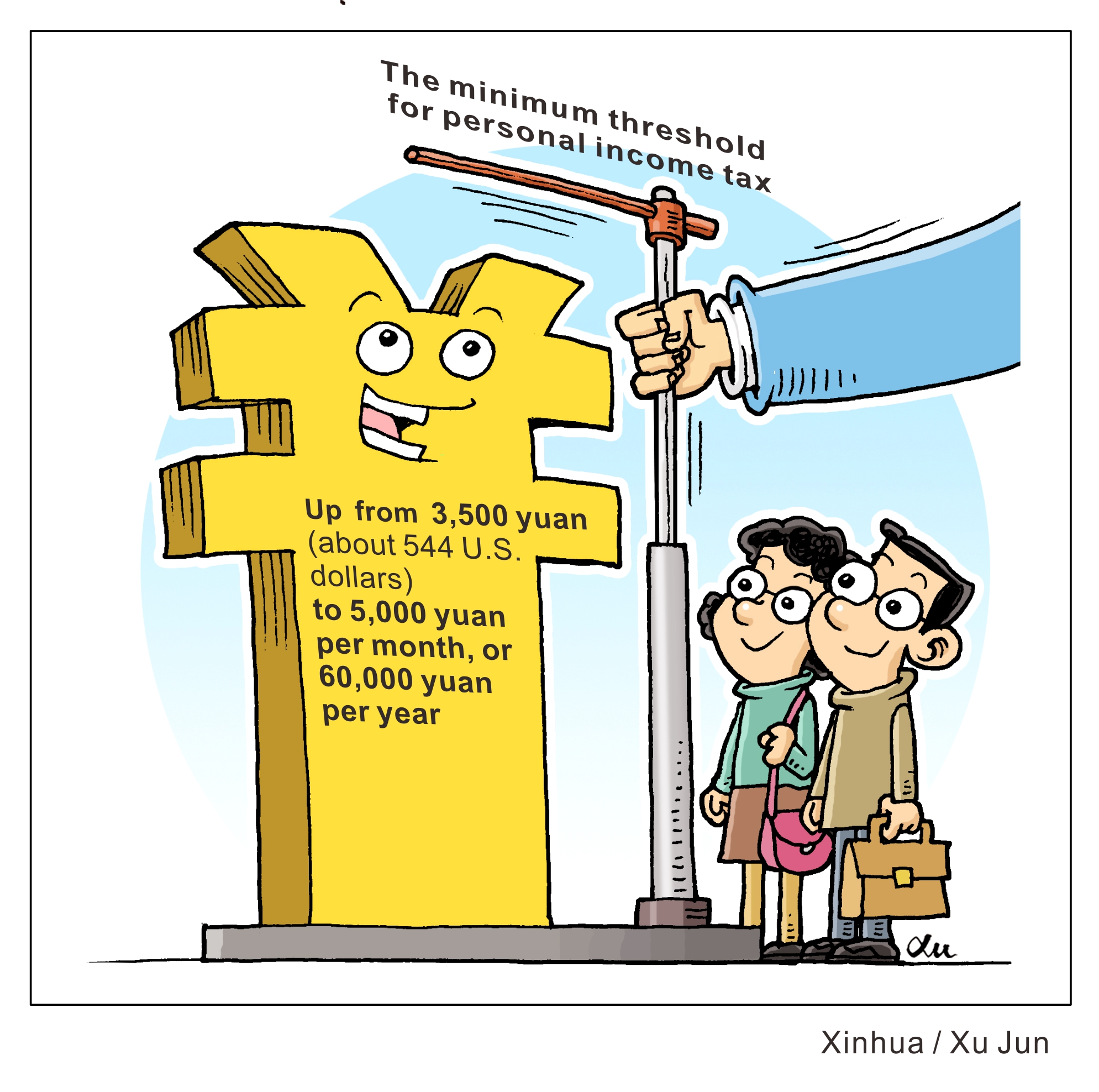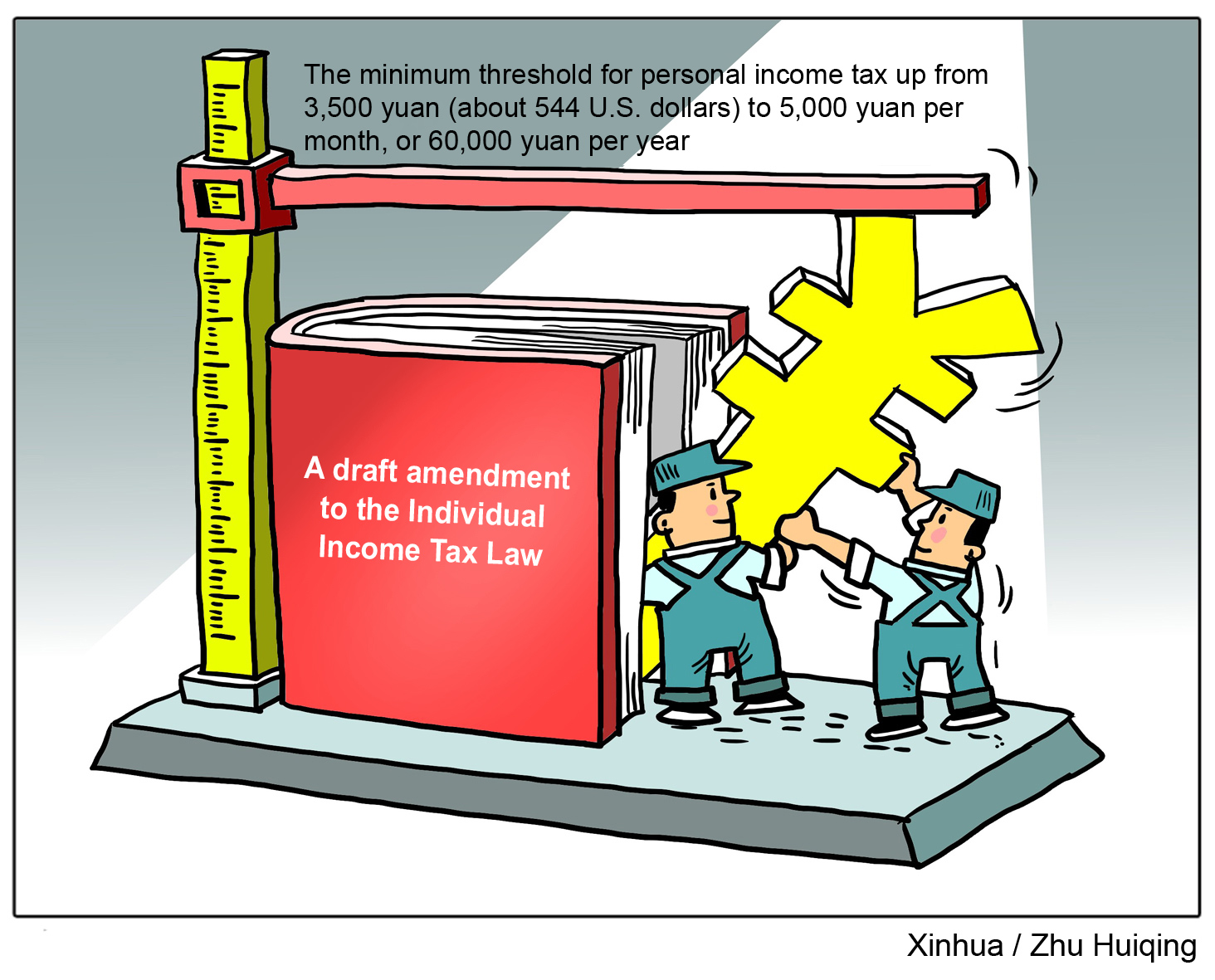This cartoon shows that China will raise the minimum threshold for personal income tax from 3,500 yuan (about 544 U.S. dollars) to 5,000 yuan per month, or 60,000 yuan per year, as proposed by China's top legislature in a draft amendment to the Individual Income Tax Law on Tuesday. (Xinhua/Chen Congying/Zhu Huiqing)