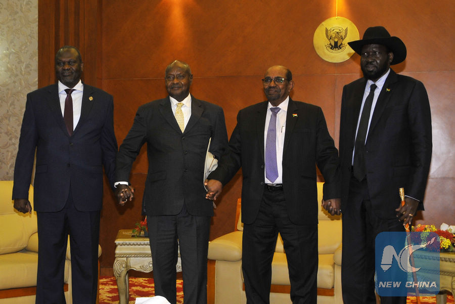 Sudanese President Omar al-Bashir (2nd R) meets with South Sudan President Salva Kiir Mayardit (1st R), Ugandan President Yoweri Museveni (2nd L) and South Sudan Opposition Leader Riek Machar (1st L) in Khartoum, Sudan, June 25, 2018. (Xinhua/Mohamed Khidir)