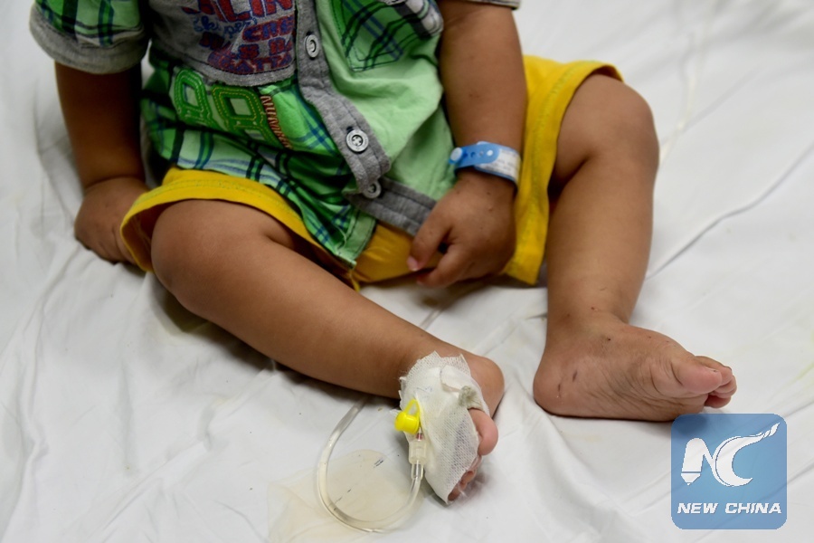 Photo taken on July 3, 2016 shows a child receiving chemotherapy treatment at the Children's Cancer Hospital Egypt 57357 in Cairo, Egypt. (Xinhua/Zhao Dingzhe)