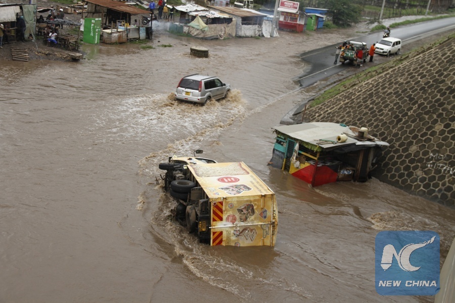 Photo taken on April 24, 2018 shows a submerged vehicle in Nairobi, capital of Kenya. Kenya's capacity to respond to negative impacts of climate change has suffered a severe blow as floods continue to wreak havoc in many parts of the country this long rain season. (Xinhua/Fred Mutune)