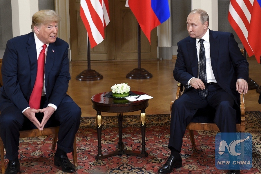 U.S. President Donald Trump (L) meets with his Russian counterpart Vladimir Putin inHelsinki, Finland, on July 16, 2018. (Xinhua/Lehtikuva/Heikki Saukkomaa)