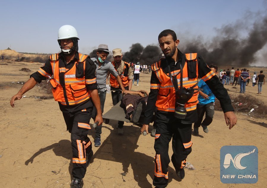 Palestinian medics carry a wounded man during clashes with Israeli troops on the Gaza-Israel border, east of the southern Gaza Strip City of Khan Younis, on June 22, 2018. (Xinhua/Khaled Omar)