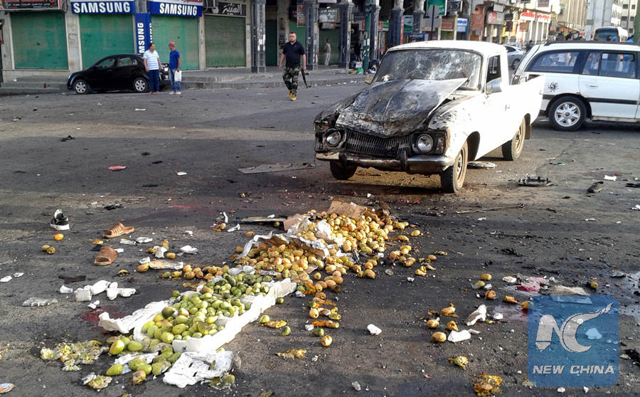 Fruits are seen scattered on the ground after a suicide bombing in Sweida, in southern Syria, on July 25, 2018. (Xinhua/Ammar Safarjalani)