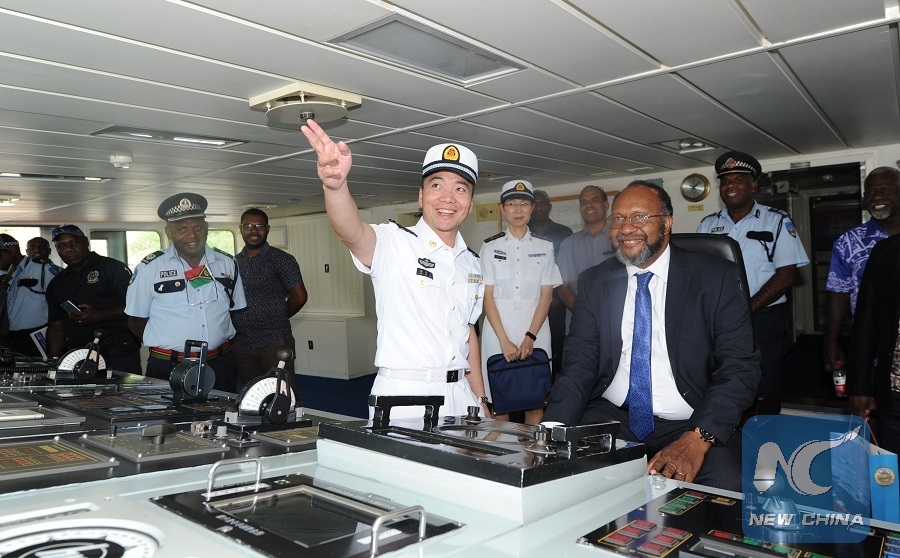 Prime Minister of Vanuatu Charlot Salwai visits the Chinese naval hospital ship Ark Peace in Port Vila, Vanuatu, July 23, 2018. (Xinhua/Jiang Shan)