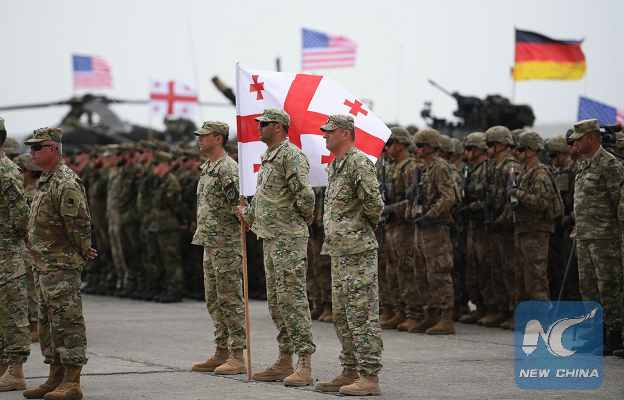 Soldiers take part in the multinational military drill named "Noble Partner 2018" at Vaziani base near Tbilisi, Georgia, Aug. 1, 2018. (Xinhua/Kulumbegashvili Tamuna)
