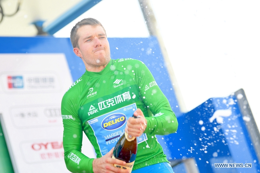 Brenton Jones from Delko-Marseille Provence KTM celebrates with the green jersey at the award ceremony of the twelfth stage of the Tour of Qinghai Lake in Yinchuan, northwest China's Ningxia Hui Autonomous Region, on August 3, 2018. (Xinhuanet Photo by Pan Binbin)