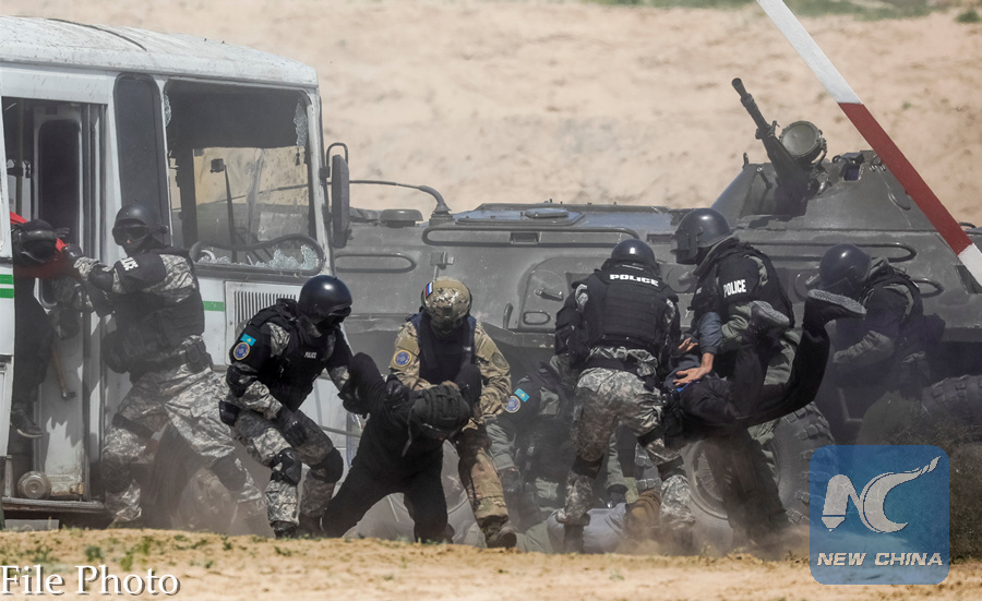 Members of special operations unit practice detaining militants during the Collective Security Treaty Organisation (CSTO) military exercise outside Almaty, Kazakhstan May 22, 2018. (REUTERS PHOTO)