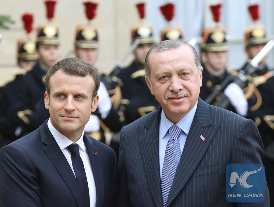 In this file photo taken on January 5, 2018 French President Emmanuel Macron (L) welcomes his Turkish counterpart Recep Tayyip Erdogan upon his arrival for their meeting and luncheon at the Elysee palace in Paris. (AFP photo)