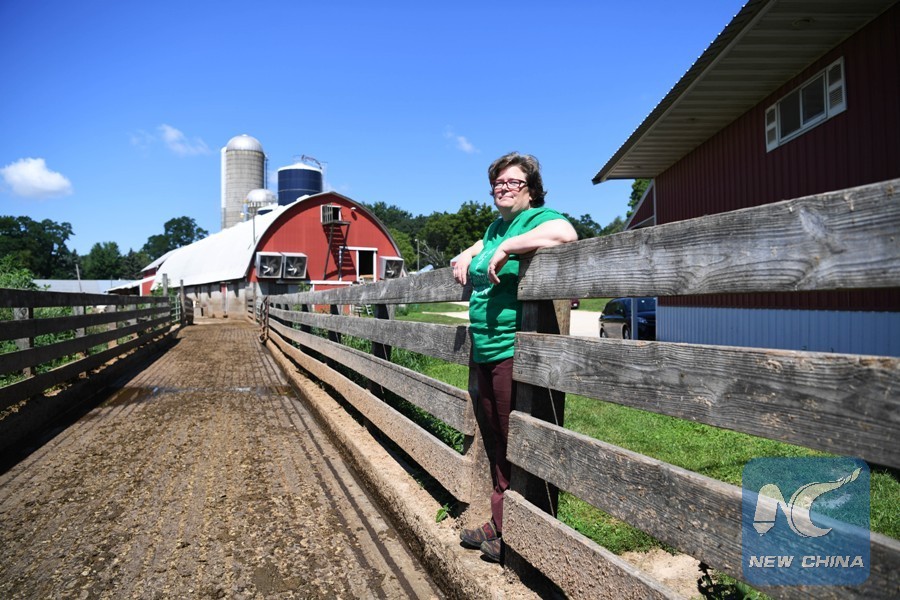Photo taken on July 24, 2018 shows dairy farmer Sarah Lloyd standing in Neldell farm located in rural Dells of Wisconsin, the United States. TO GO WITH Feature: U.S. dairy farm to celebrate centenary while shutdown looms amid tariffs (Xinhua/Liu Jie)