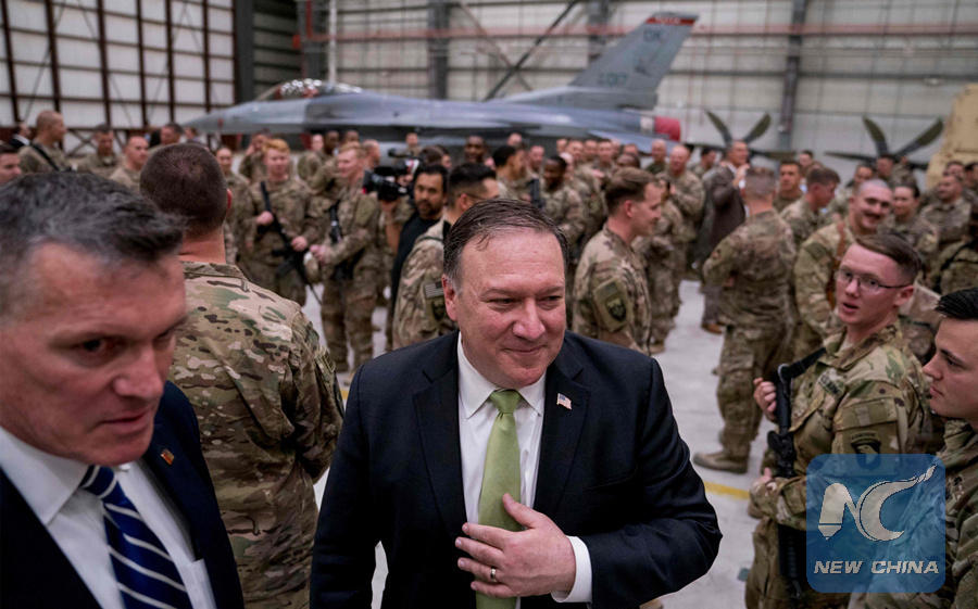 U.S. Secretary of State Mike Pompeo greets coalition forces at Bagram Air Base, Afghanistan on July 9, 2018. (AFP PHOTO)