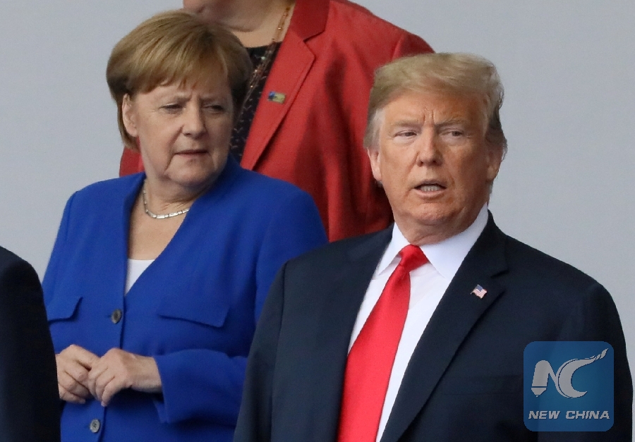 File Photo: German Chancellor Angela Merkel and U.S. President Donald Trump are seen as they pose for a photo at the start of the NATO summit in Brussels, Belgium July 11, 2018. (Xinhua/REUTERS)
