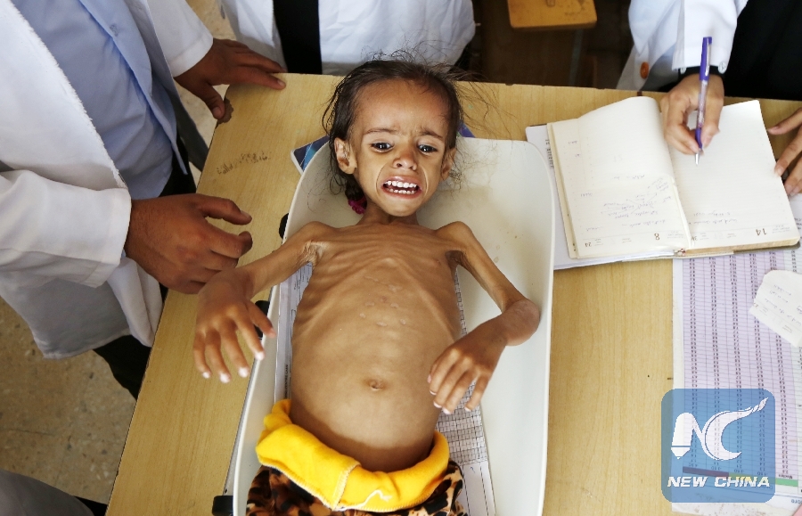 SANAA, Sept. 4 (Xinhua) -- Wijdan Mohammed Hussein is only four years old, but her face looks ten times older than age. With a tiny and skeletal body, she cannot even sit by herself.