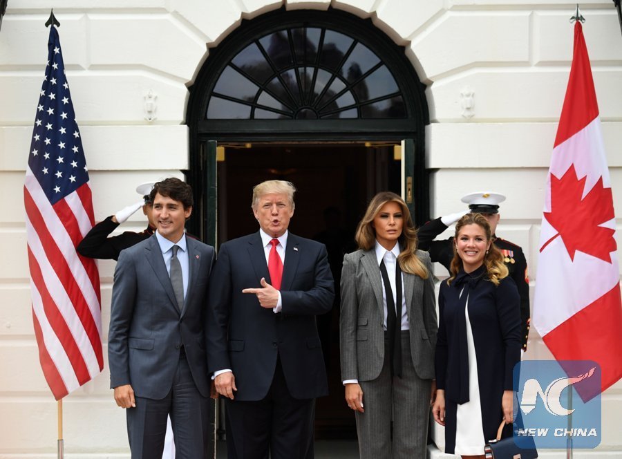 File Photo: U.S. President Donald Trump (2nd L) welcomes visiting Canadian Prime Minister Justin Trudeau (1st L) at the White House in Washington D.C., the United States, on Oct. 11, 2017. Trump met with Trudeau amid new NAFTA negotiations. (Xinhua/Yin Bogu)
