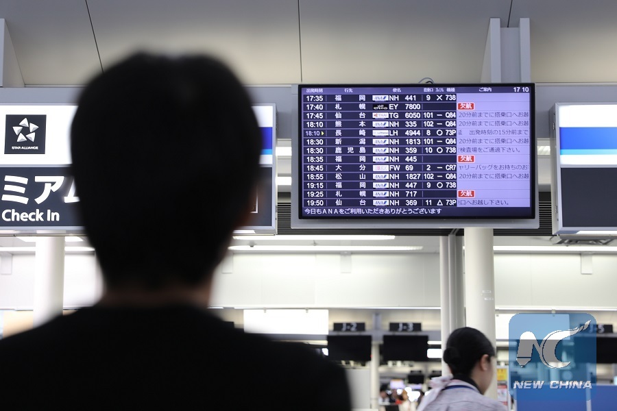 Flight information that all flights to Sapporo cancelled is seen on a screen at a terminal of Chubu Centrair International Airport, Nagoya, Japan, on Sept. 6, 2018. (Xinhua/Du Xiaoyi)