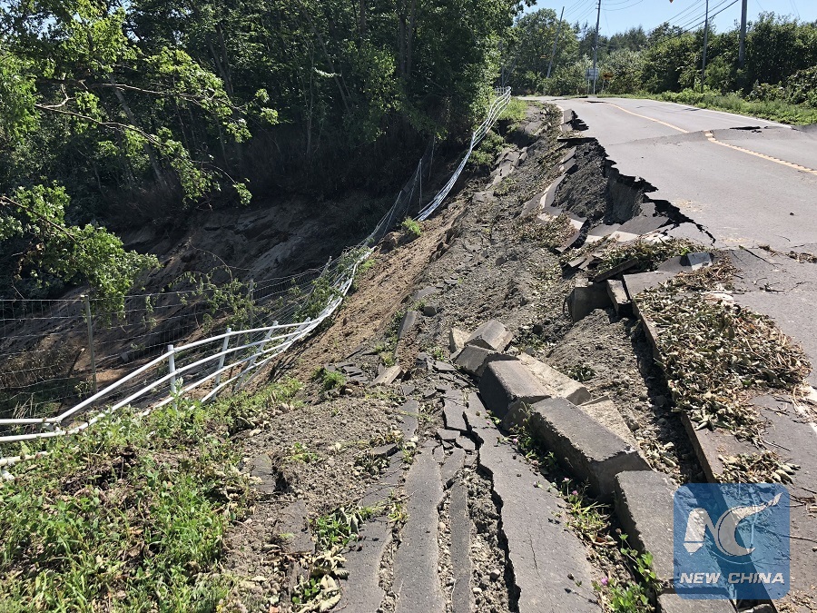 Photo taken on Sept. 6, 2018 shows a damaged road after an earthquake in the town of Atsuma, Hokkaido prefecture, Japan. (Xinhua/Deng Min)