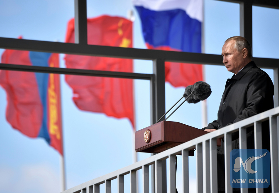 Russian President Vladimir Putin speaks at a military parade of the participants of the Vostok-2018 (East-2018) drills at Tsugol military training ground in Zabaikalsky region, Russia, on September 13, 2018. (KREMLIN PHOTO)
