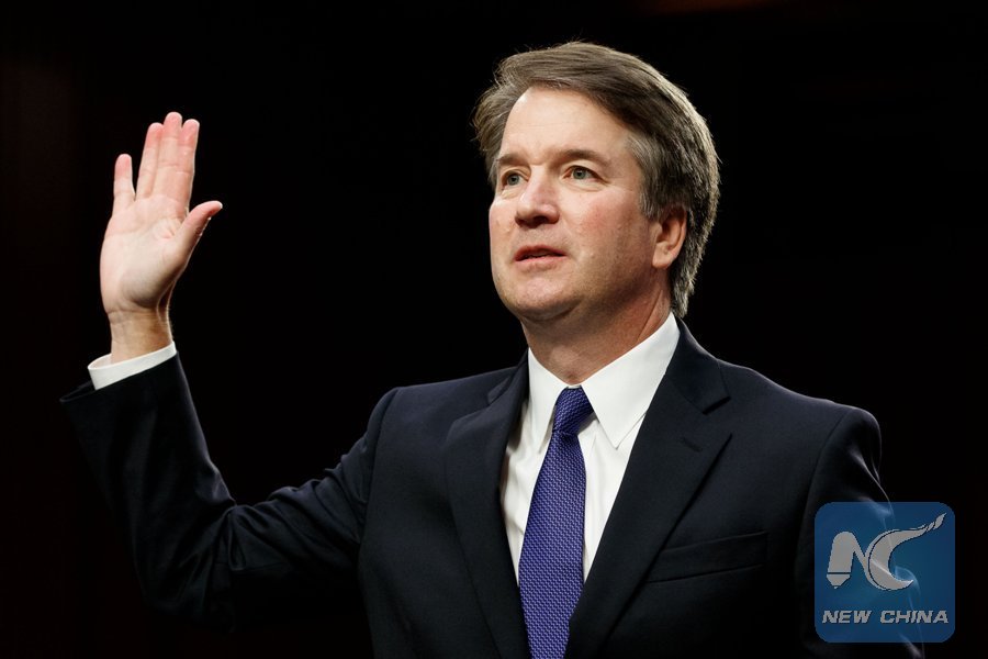 File Photo: U.S. Supreme Court nominee Judge Brett Kavanaugh swears in during his Senate confirmation hearing on Capitol Hill in Washington D.C., the United States, Sept. 4, 2018. (Xinhua/Ting Shen)
