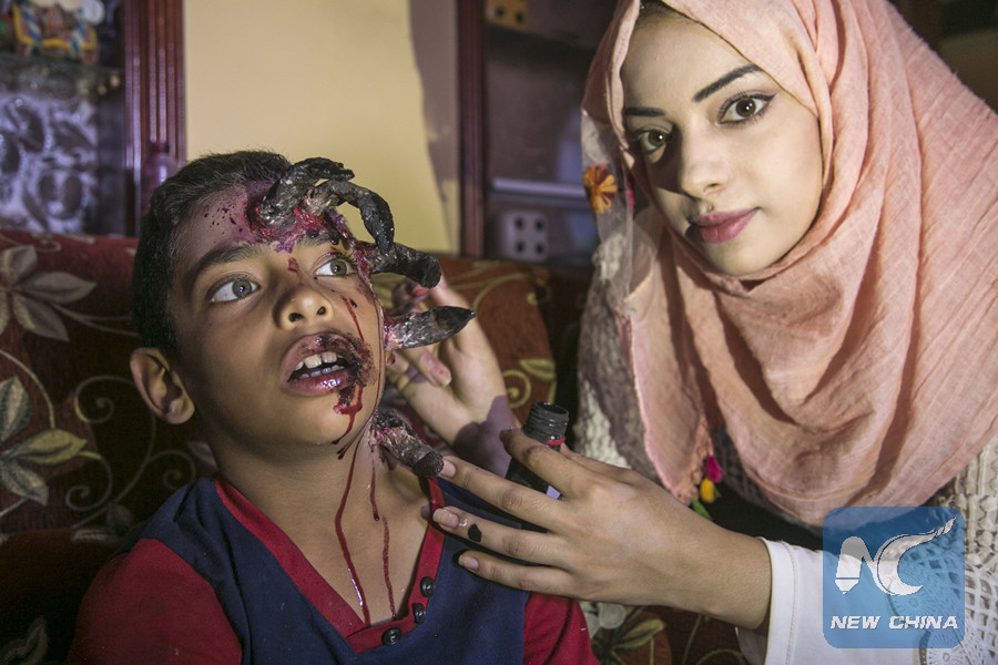 A Palestinian girl with her face painted by special effects makeup artist Alaa Abu Mustafa, 20, in the southern Gaza Strip City of Khan Younis, on Sept. 19, 2018. (Xinhua/Stringer)
