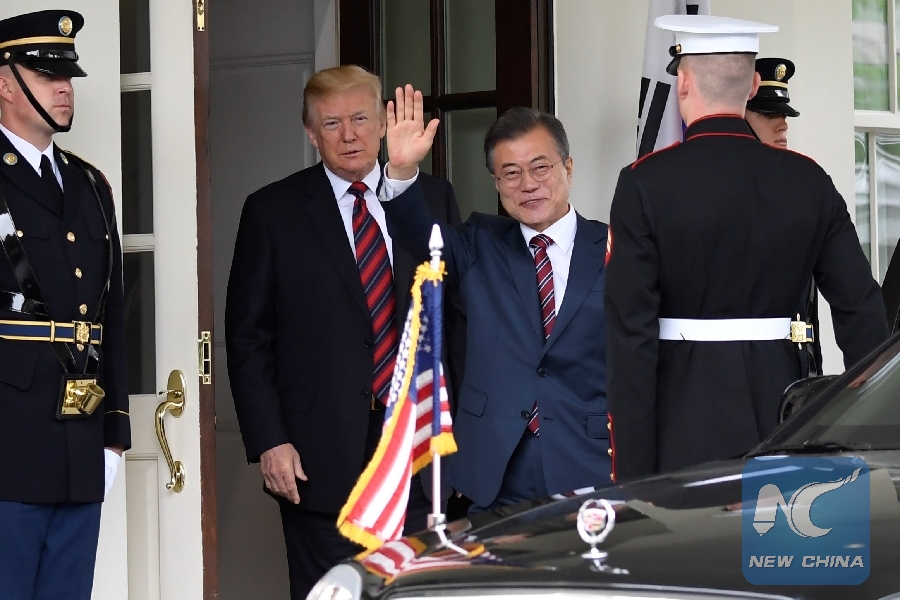 File Photo: U.S. President Donald Trump (2nd L) welcomes visiting President of the Republic of Korea (ROK) Moon Jae-in (3rd L) at the White House in Washington D.C., the United States, on May 22, 2018. (Xinhua/Yang Chenglin)