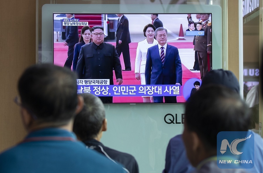 Local residents watch a TV screen displaying top leader of the Democratic People's Republic of Korea (DPRK) Kim Jong Un receiving South Korean President Moon Jae-in at the Pyongyang International Airport for their third inter-Korean summit, at a station in Seoul, South Korea, Sept. 18, 2018. (Xinhua/Lee Sang-ho)