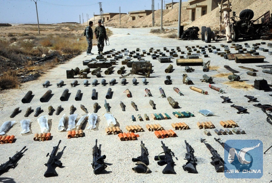 Weapons are displayed in a military base in the countryside of Damascus, Syria, on Oct. 3, 2018. The Syrian army uncovered large amounts of weapons that had been left behind by Islamic State militants in the countryside of Deir al-Zour, Hama and Sweida, according to state news agency SANA. (Xinhua/Ammar Safarjalani)