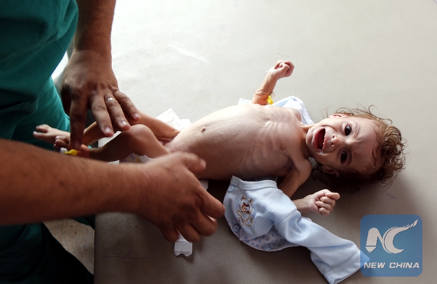 File Photo: A doctor takes a famine-suffered child's clothes to be checked at al-Sabaeen hospital in Sanaa, Yemen, on Sept. 24, 2018. (Xinhua/Mohammed Mohammed)