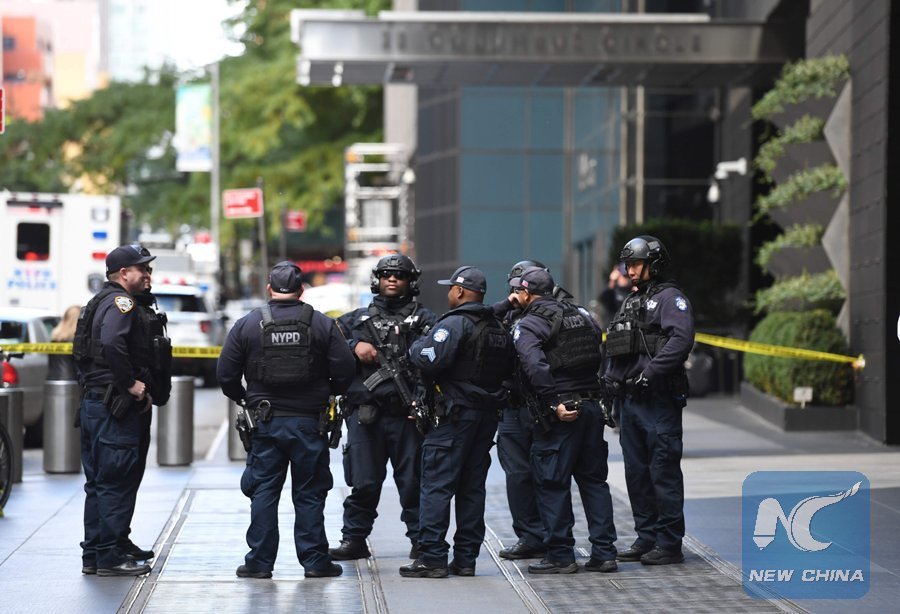 Police stand outside the Time Warner Building on Oct. 24, 2018 where a suspected explosive device was found in the building after it was delivered to CNN's New York bureau. (AFP Photo)