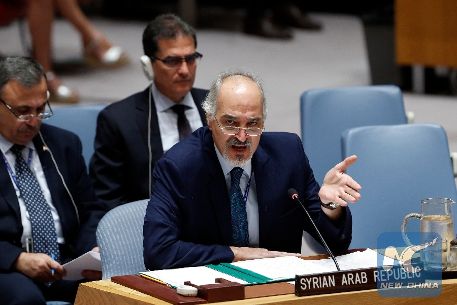 File Photo: Syrian Ambassador to the United Nations Bashar Jaafari (front) speaks during a Security Council meeting at the UN headquarters in New York, Aug. 28, 2018. (Xinhua/Li Muzi)