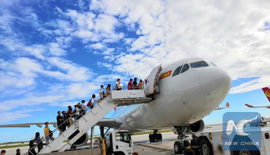 Chinese tourists get on board to fly back home in Saipan, the Commonwealth of the Northern Mariana Islands (CNMI), Oct. 28, 2018. (Xinhua)