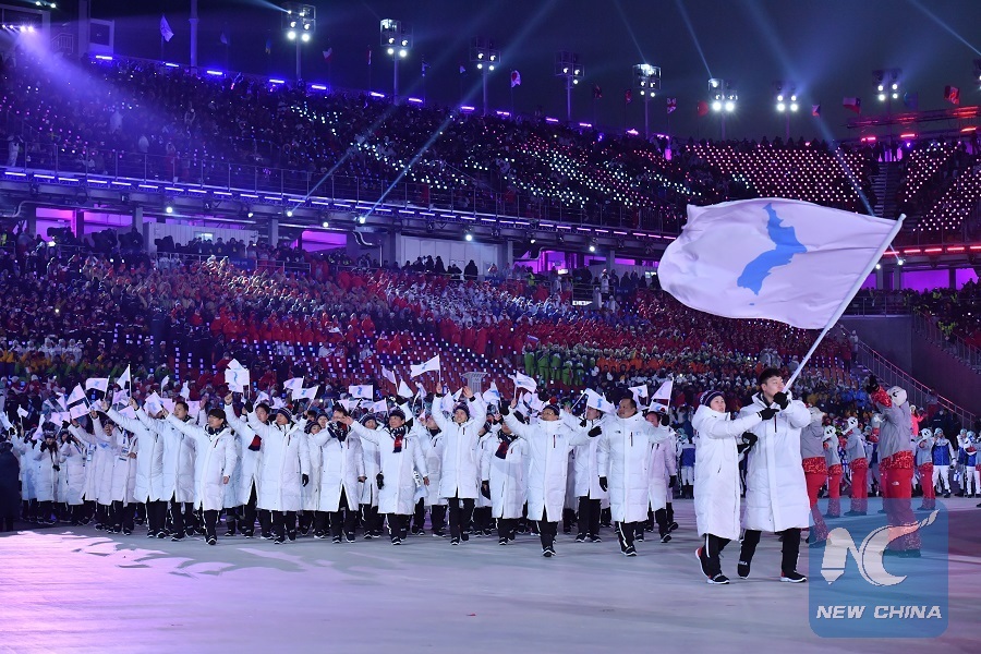 In this file photo, the Democratic People's Republic of Korea (DPRK) and South Korea marched together under a unified Korean flag during the opening ceremony of the 2018 PyeongChang Winter Olympic Games at PyeongChang Olympic Stadium in PyeongChang, South Korea, Feb. 9, 2018. (Xinhua/Lui Siu Wai)